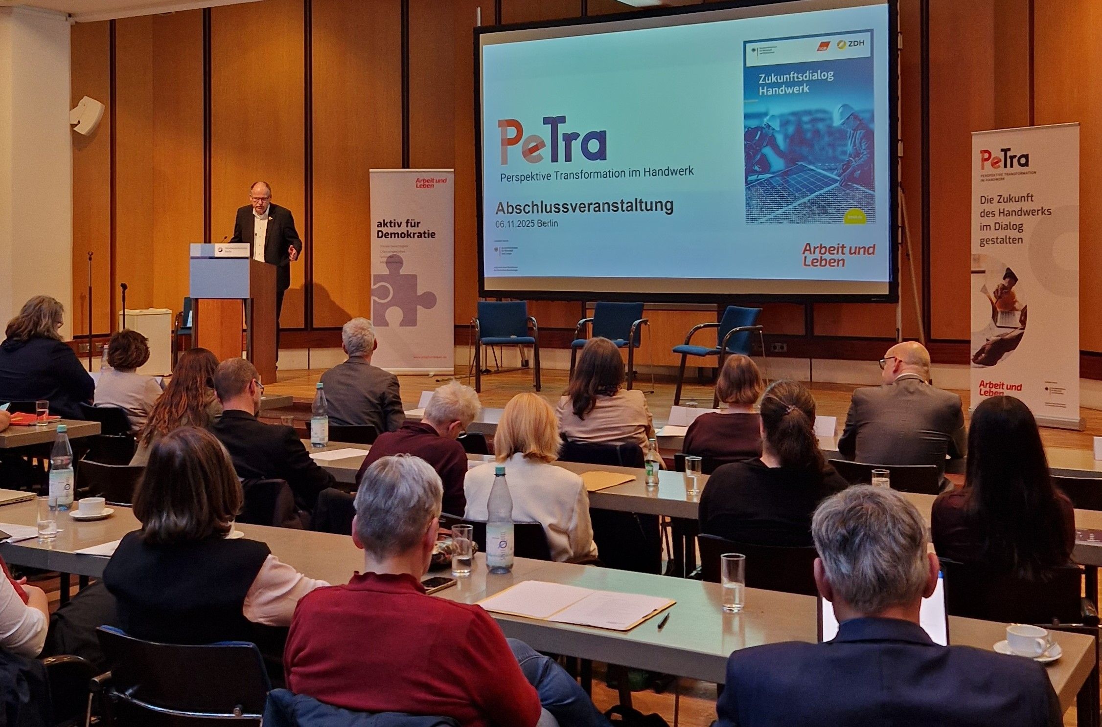 Am 6. November 2025 fand das Projekt PeTra seinen gelungenen Abschluss. Barbara Menke, Bundesgeschäftsführerin von Arbeit und Leben, eröffnete die Veranstaltung im Großen Saal des BTZ der Handwerkskammer Berlin. Grußworte kamen von Stefan Körzell, Mitglied des Geschäftsführenden DGB-Bundesvorstandes und Ministerialdirigenten Boris Petschulat, Abteilungsleiter beim Bundeswirtschaftsministerium. Beide schätzten nach der Erläuterung des Verlaufs und die wesentlichen Ergebnisse des Projektes durch Tobias Kriele, Projektkoordinator beim Bundearbeitskreis Arbeit und Leben, in einem anschließenden Podiumsgespräch den Beitrag des Projektes zum Zukunftsdialog Handwerk als sehr positiv ein.